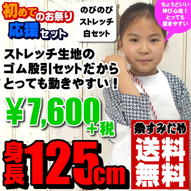 <送料無料キャンペーン> 初めてのお祭り応援セットのびのびセット(白)サイズ:125(7〜8歳用)ほどよく伸びるストレッチ素材のゴム股引使用 [ 祭り 衣装 子供 お祭り用品 お祭り 衣装 子供 ストレッチ 股引 ゴム 祭 ]